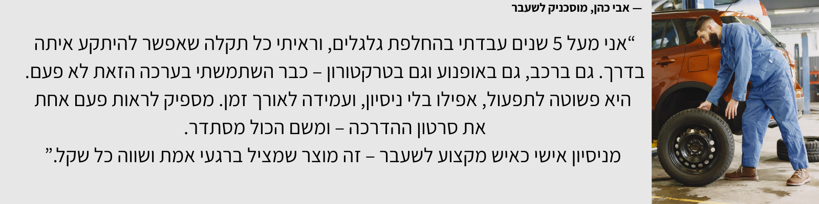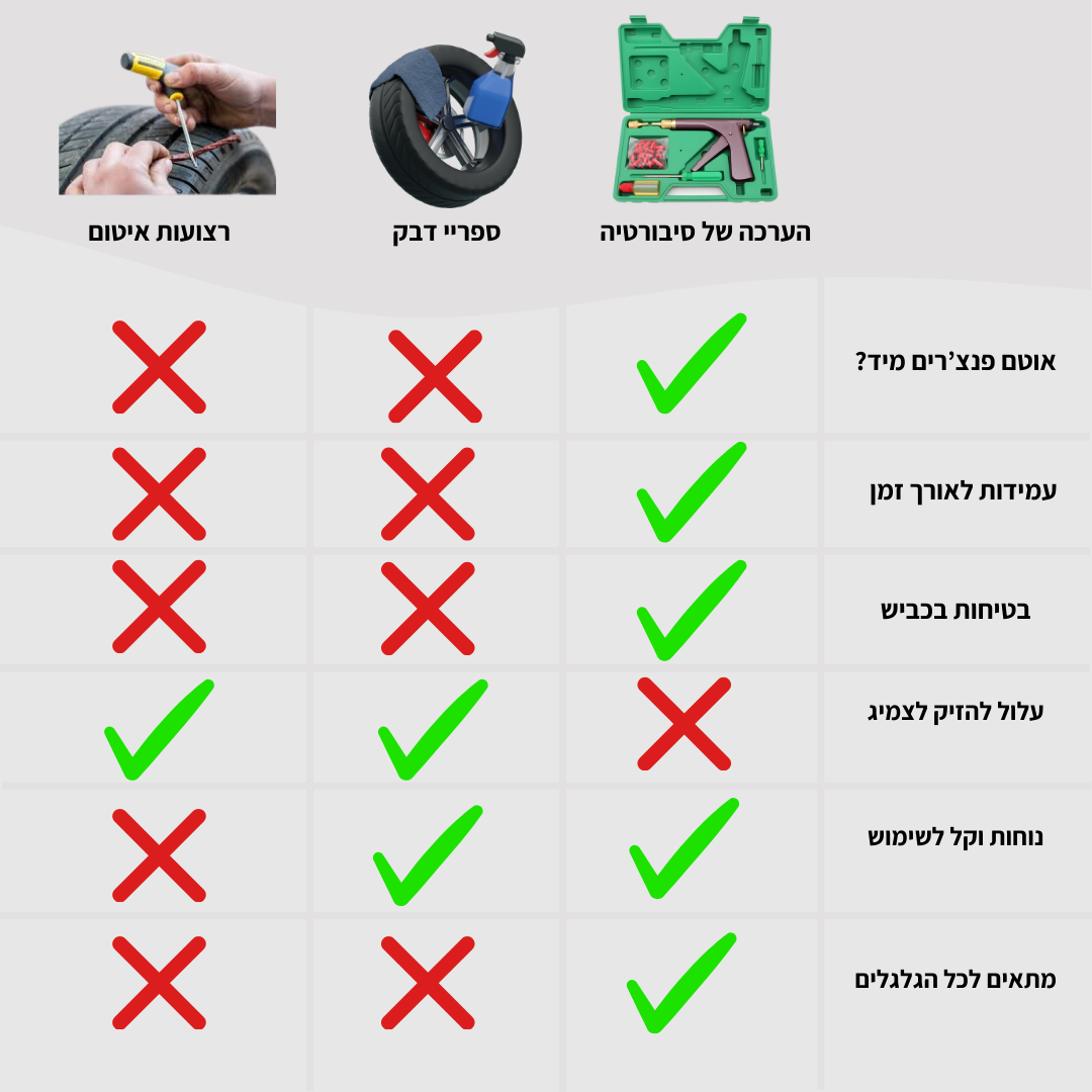 “תמיד התמודדתי עם תקרים ספריי דבק, גומיות ושום דבר לא החזיק, ובסוף הייתי צריך להחליף גלגל כל פעם. עכשיו עם הערכה הזו זה פשוט מדהים! יש לי אופניים לילדים וגם רכב פרטי, וכבר יצא לי להשתמש בה. עובדת מעולה! תודה רבה, ממליץ לכל נהג – זה מוצר חובה שיהיה איתך בכל מקום!”