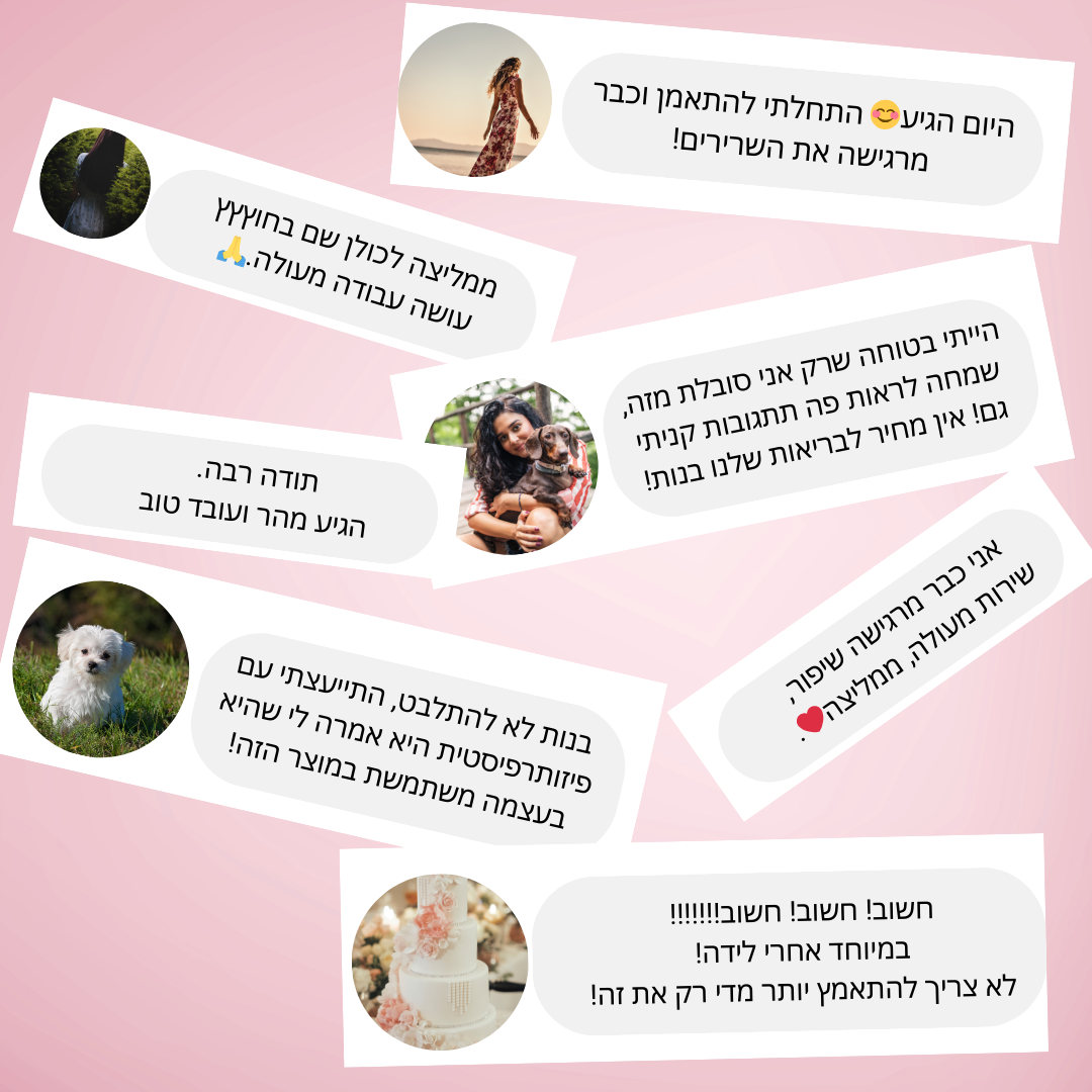 "אני לא מבינה איך לא שמעתי את זה קודם אני אחרי 2 לידות ותמיד היו לי לחצים באזור שם עכשיו אני שבועיים אחרי עם המוצר ומרגישה כבר שיפור! אני לא יודעת מה הייתי עושה בלעדיכם תודה על הכול!"